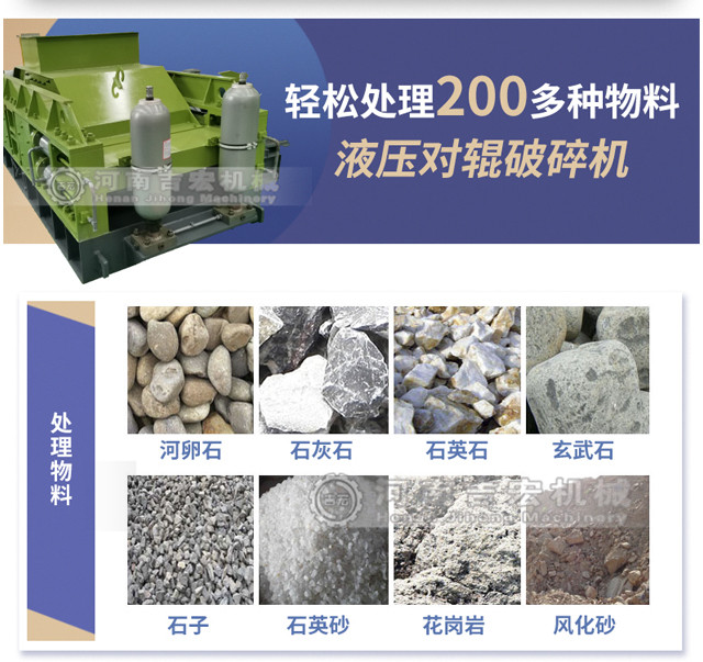 對輥式破碎機將破碎物料經給料口落入兩輥子之間,進行擠壓破碎,成品物料自然落下。遇有過硬或不可破碎物時,對輥式破碎機的輥子可憑液壓缸或彈簧的作用自動退讓,使輥子間隙增大,過硬或不可破碎物落下,從而保護機器不受損壞。相向轉動的兩輥子有一定的間隙,改變間隙,即可控制產品最大排料粒度。